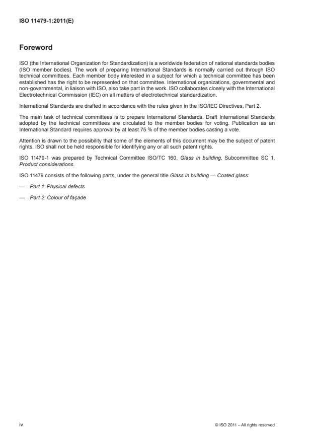 ISO 11479-1:2011 is a standard published by the International Organization for Standardization (ISO). Its full title is "Glass in building — Coated glass — Part 1: Physical defects". This standard covers: This part of ISO 11479 specifies optical quality requirements for coatings applied to glass using either pyrolytic, sol-gel or vacuum (sputtering) deposition methods for use in building glazing. More specifically, this part of ISO 11479 relates to low-e and solar-control coated glass. This part of ISO 11479 is not applicable to patterned or other optically distorting glass.
