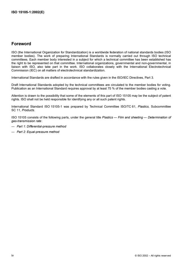 ISO 15105-1:2002 is a standard published by the International Organization for Standardization (ISO). Its full title is "Plastics — Film and sheeting — Determination of gas-transmission rate — Part 1: Differential-pressure method". This standard covers: ISO 15105-1:2002 specifies a method for determining the gas transmission rate of any plastic material in the form of film, sheeting, laminate, co-extruded material or flexible plastic-coated material under a differential pressure.