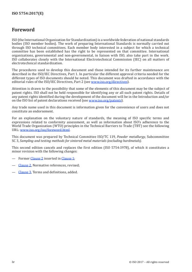 ISO 5754:2017 is a standard published by the International Organization for Standardization (ISO). Its full title is "Sintered metal materials, excluding hardmetals — Unnotched impact test piece". This standard covers: ISO 5754 specifies the dimensions of an unnotched impact test piece of sintered metal materials. The test piece may be obtained directly by pressing and sintering or by machining a sintered part. ISO 5754 applies to all sintered metals and alloys, with the exception of hardmetals. However, for certain materials (for example, materials with low porosity or materials with high ductility), it may be more appropriate to use a notched test piece which, in this case, will give results with less scatter. (In this case, refer to ISO 148‑1.) NOTE For porous sintered materials, the results obtained from impact tests are not necessarily very accurate compared with results obtained from tests on solid metals.