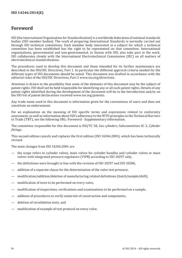 ISO 14246:2014 is a standard published by the International Organization for Standardization (ISO). Its full title is "Gas cylinders — Cylinder valves — Manufacturing tests and examinations". This standard covers: ISO 14246:2014 specifies the procedures and acceptance criteria for manufacturing testing and examination of cylinder valves that have been manufactured to achieve type approval. ISO 14246:2014 is applicable to cylinder valves intended to be fitted to refillable transportable gas cylinders, main valves (excluding ball valves) for cylinder bundles and cylinder valves or main valves with integrated pressure regulator (VIPR) designed and type tested according to ISO 10297.