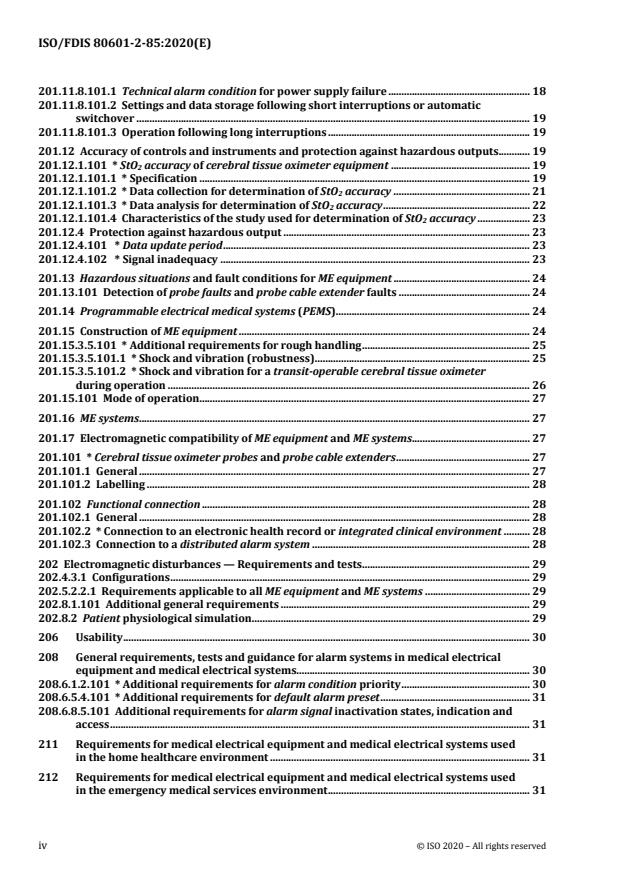 ISO 80601-2-85:2021 is a standard published by the International Organization for Standardization (ISO). Its full title is "Medical electrical equipment - Part 2-85: Particular requirements for the basic safety and essential performance of cerebral tissue oximeter equipment". This standard covers: This document applies to basic safety and essential performance of cerebral tissue oximeter equipment, that employs light at multiple wavelengths to derive a quantitative measure of oxygen saturation of haemoglobin within the volume of tissue sampled under the probe attached to the head. The cerebral tissue oximeter equipment can be based on continuous light, frequency domain or time domain technologies. This document applies to ME equipment used in a hospital environment as well as when used outside the hospital environment, such as in ambulances and air transport. Additional standards may apply to ME equipment for those environments of use. NOTE 1 Cerebral tissue oximeters are sometimes referred to as near infrared spectroscopy equipment in medical literature. Not included within the scope of this document are: invasive tissue or vascular oximeters; oximeters that require a blood sample from the patient; equipment measuring dissolved oxygen; ME equipment, or part thereof, that measures path-length-dependent haemoglobin change. The requirements for functional near-infrared spectroscopy equipment are found in ISO 80601-2-71[4]; ME equipment, or part thereof, that measures arterial saturation based on pulsatile changes in tissue optical properties (SpO2). The requirements for pulse oximeter equipment are found in ISO 80601‑2‑61[3]; ME equipment, or any part thereof, that claims to monitor tissue in parts of the body other than the head. This document also applies to cerebral tissue oximeter equipment, including cerebral tissue oximeter monitors, cerebral tissue oximeter probes and probe cable extenders, that have been remanufactured. If a clause or subclause is specifically intended to be applicable to ME equipment only, or to ME systems only, the title and content of that clause or subclause will say so. If that is not the case, the clause or subclause applies both to ME equipment and to ME systems, as relevant. Hazards inherent in the intended physiological function of ME equipment or ME systems within the scope of this document are not covered by specific requirements in this document except in 201.11 and in 201.7.2.13 and 201.8.4.1 of the general standard. NOTE 2 See also 4.2 of the general standard. This document can also be applied to ME equipment and their accessories used for compensation or alleviation of disease, injury or disability. This document is not applicable to remote or slave (secondary) equipment that displays StO2 values that are located outside of the patient environment. NOTE 3 ME equipment that provides selection between diagnostic and monitoring functions is expected to meet the requirements of the appropriate document when configured for that function.