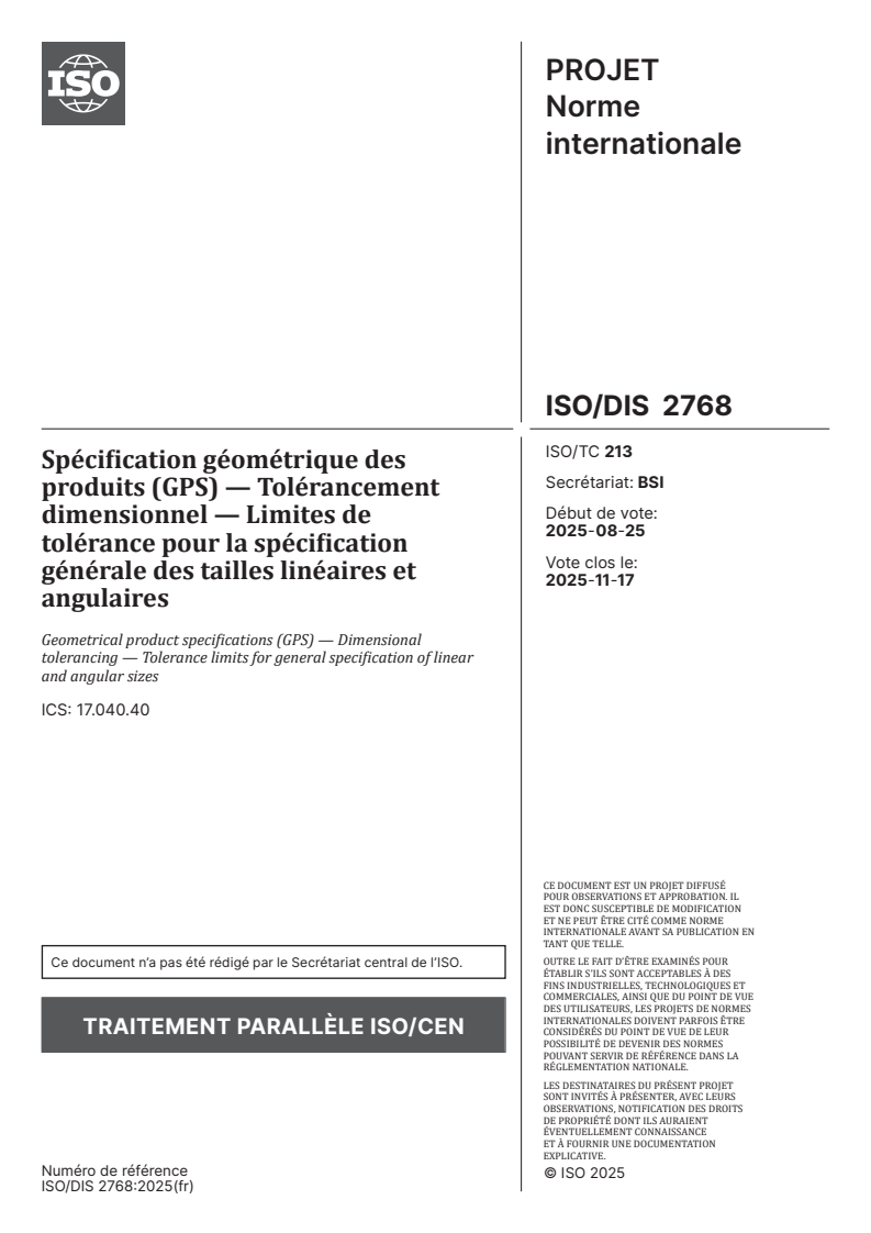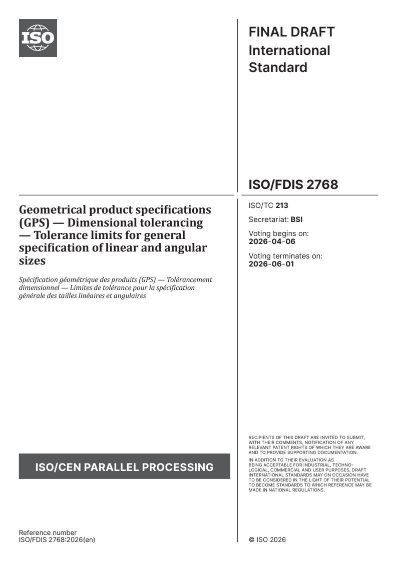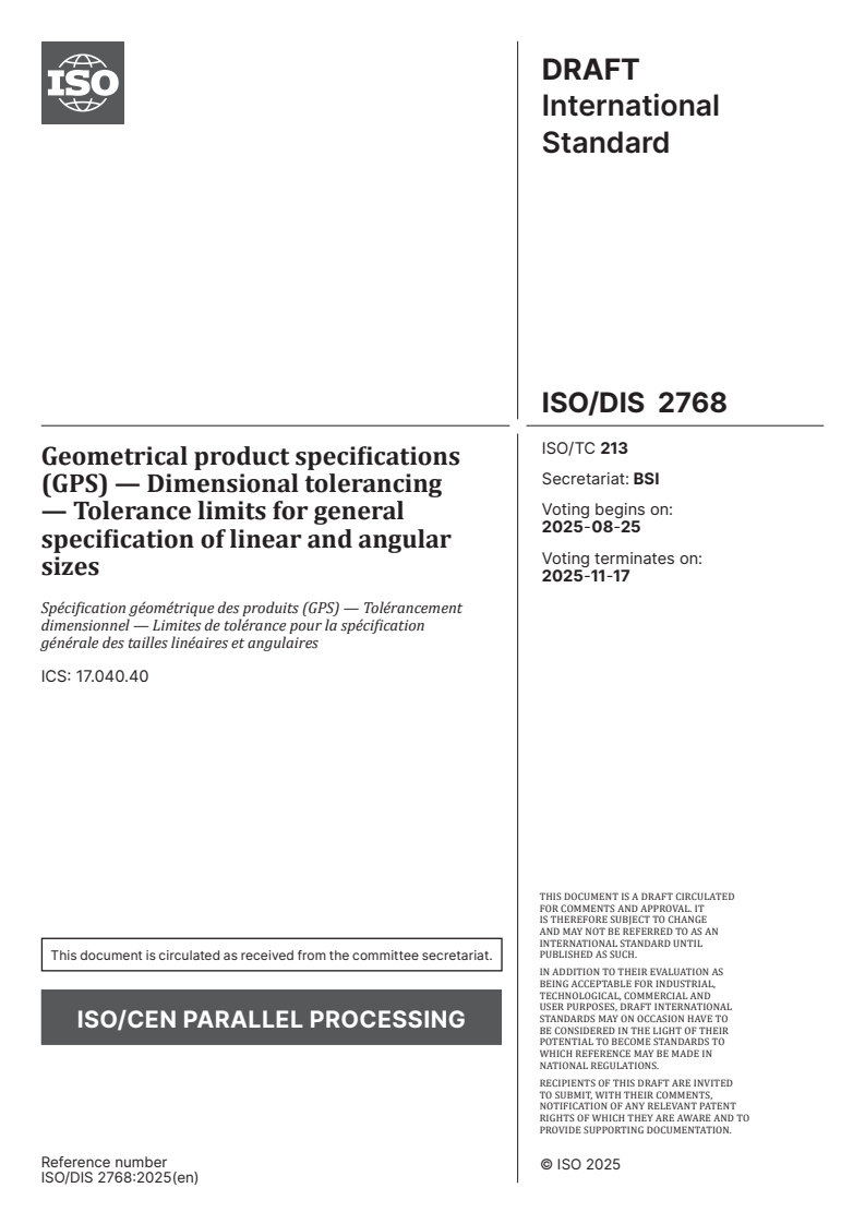 ISO/FDIS 2768 - Geometrical product specifications (GPS) — Dimensional tolerancing — Tolerance limits for general specification of linear and angular sizes/30/2025