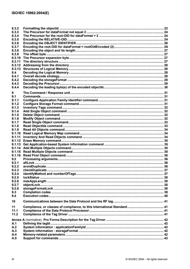 ISO/IEC 15962:2004 is a standard published by the International Organization for Standardization (ISO). Its full title is "Information technology - Radio frequency identification (RFID) for item management - Data protocol: data encoding rules and logical memory functions". This standard covers: The data protocol used to exchange information in a radio-frequency identification (RFID) system for item management is specified in ISO/IEC 15961:2004 and in ISO/IEC 15962:2004. Both are required for a complete understanding of the data protocol in its entirety; but each focuses on one particular interface: ISO/IEC 15961:2004 addresses the interface with the application system. ISO/IEC 15962:2004 deals with the processing of data and its presentation to the RF tag, and the initial processing of data captured from the RF tag. ISO/IEC 15962:2004 focuses on encoding the transfer syntax, as defined in ISO/IEC 15961:2004 according to the application commands defined in that International Standard. The encodation is in a Logical Memory as a software analogue of the physical memory of the RF tag being addressed by the interrogator. ISO/IEC 15962:2004 defines the encoded structure of object identifiers; specifies the data compaction rules that apply to the encoded data; specifies a Precursor for encoding syntax features efficiently; specifies formatting rules for the data, e.g. depending on whether a directory is used or not; defines how application commands, e.g. to lock data, are transferred to the Tag Driver; defines other communication to the application.