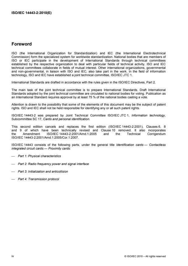 ISO/IEC 14443-2:2010 is a standard published by the International Organization for Standardization (ISO). Its full title is "Identification cards — Contactless integrated circuit cards — Proximity cards — Part 2: Radio frequency power and signal interface". This standard covers: ISO/IEC 14443-2:2010 specifies the characteristics of the fields to be provided for power and bi-directional communication between proximity coupling devices (PCDs) and proximity cards or objects (PICCs). It does not specify the means of generating coupling fields, nor the means of compliance with electromagnetic radiation and human exposure regulations, which can vary according to country.