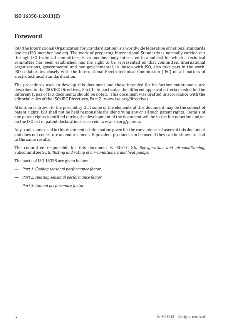 ISO 16358-1:2013 specifies the testing and calculating methods for seasonal performance factor of equipment covered by ISO 5151, ISO 13253 and ISO 15042. ISO 16358-1:2013 also specifies the seasonal performance test conditions and the corresponding test procedures for determining the seasonal performance factor of equipment, as specified above, under mandatory test conditions and is intended for use only in marking, comparison, and certification purposes. For the purposes of ISO 16358-1:2013, the rating conditions are those specified under T1 in the reference standards above. The procedures in ISO 16358-1:2013 may be used for other temperature conditions. ISO 16358-1:2013 does not apply to the testing and rating of: water-source heat pumps or water-cooled air conditioners; portable units having a condenser exhaust duct; individual assemblies not constituting a complete refrigeration system; or equipment using the absorption refrigeration cycle.