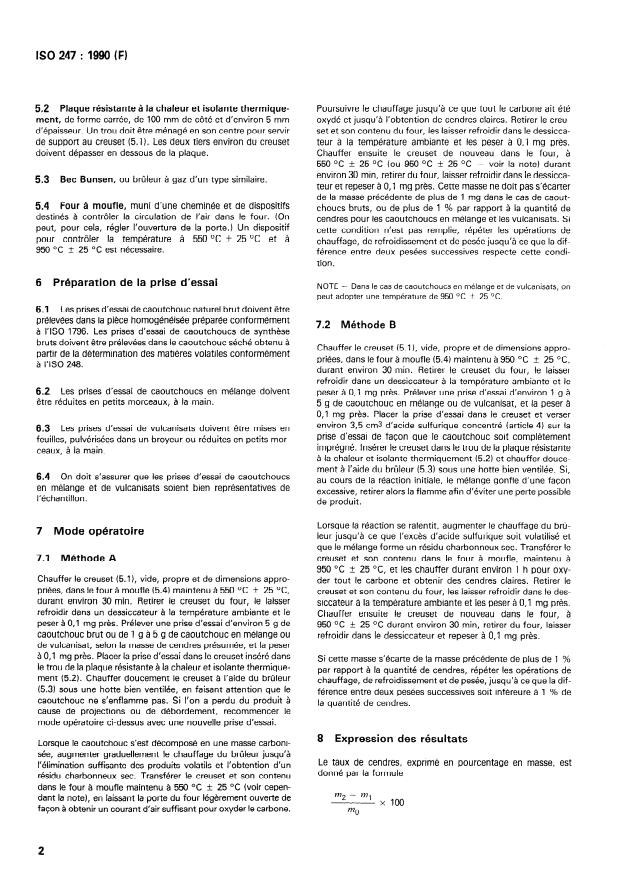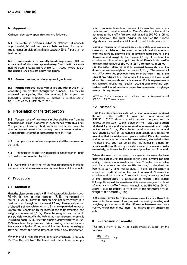 ISO 247:1990 is a standard published by the International Organization for Standardization (ISO). Its full title is "Rubber — Determination of ash". This standard covers: The two methods are applicable to raw, compounded and vulcanized rubbers of the families described in ISO 1629. The principle of method A consists in heating a weighed test portion in a crucible over a gas burner, followed by volatilization of the decomposition products and transfer of the crucible to a muffle furnace. The crucible is heated until all the carbonaceous matter has been burnt off and constant mass is attained. In method B a weighed test portion is heated in a crucible in the presence of sulfuric acid, first by means of a gas burner and then in a muffle furnace as in method A. Platinum crucibles shall be used for ashing fluorine-containing and lithium-polymerized rubbers. Cancels and replaces the second edition ISO 247:1978, which contains three methods of determination.