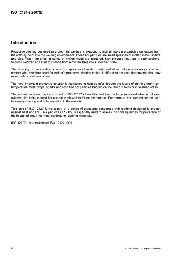 ISO 12127-2:2007 specifies a test method designed to evaluate the heat transfer and the behaviour of materials used for protective clothing when such materials are struck by high temperature metal particles, especially when these are trapped in the folds of the garment in working situations. The results obtained by this method permit the comparison of the behaviour of different materials which have undergone this test under standardized conditions. They do not permit conclusions to be drawn with respect to contacts with large splashes of molten cast iron or other metal, nor do they allow the behaviour of complete garments under industrial conditions to be predicted.