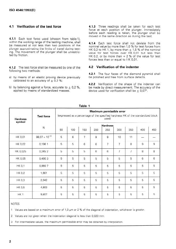ISO 4546:1993 is a standard published by the International Organization for Standardization (ISO). Its full title is "Metallic materials — Hardness test — Verification of Knoop hardness testing machines". This standard covers: Specifies a direct and an indirect method with test forces up to and including 9,807 N applicable only for indentations with long diagonals longer than or equal to 20 micrometres.