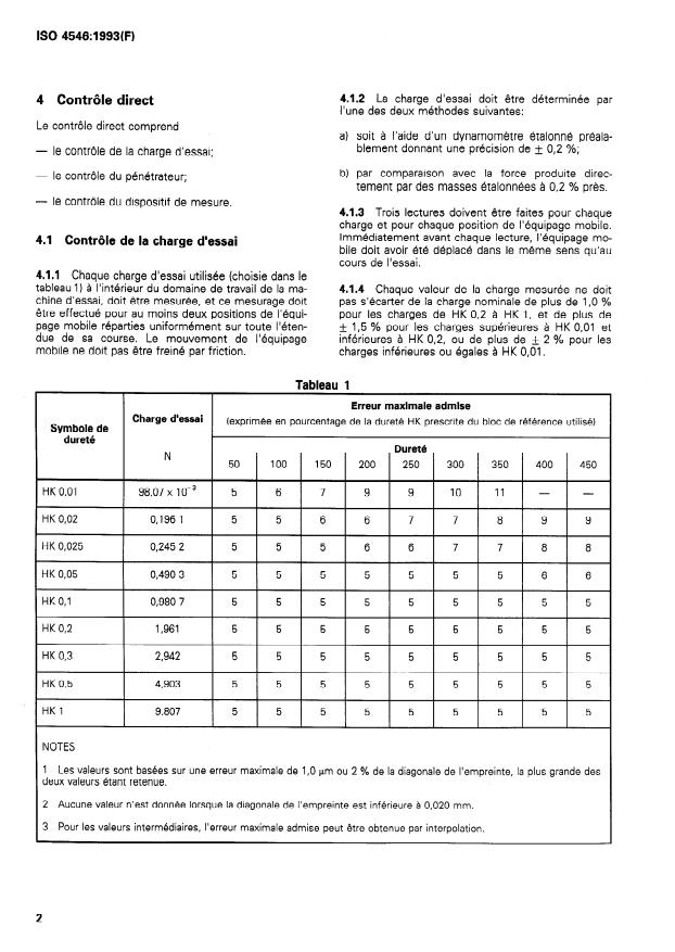 tableau 1) à l’intérieur du domaine de travail de la ma- 4.1.4 Chaque valeur de la charge mesurée ne doit