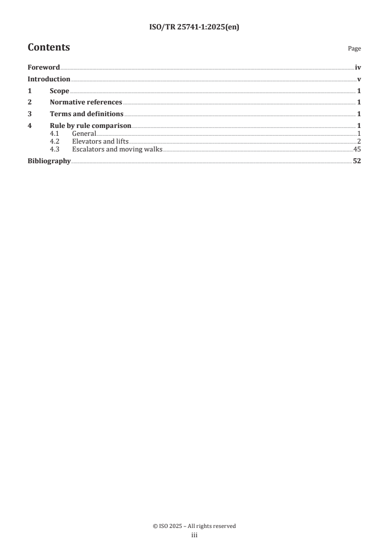 - Comparative tables and figures: Tabulated comparisons for elevators/lifts and escalators/moving walks, highlighting clause‑level differences and commonalities to support harmonization.
