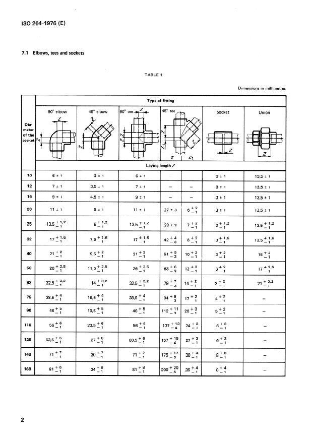 ISO 264:1976 is a standard published by the International Organization for Standardization (ISO). Its full title is "Unplasticized polyvinyl chloride (PVC) fittings with plain sockets for pipes under pressure — Laying lengths — Metric series". This standard covers: Contains tables with specifications of dimensions and tolerances of unplasticized PVC-fittings under pressure, fitting together with the specified nominal outside diameters of tubes according ISO 161-1. It should be used as a guide to manufacturers and users and as a basis for specific standards.