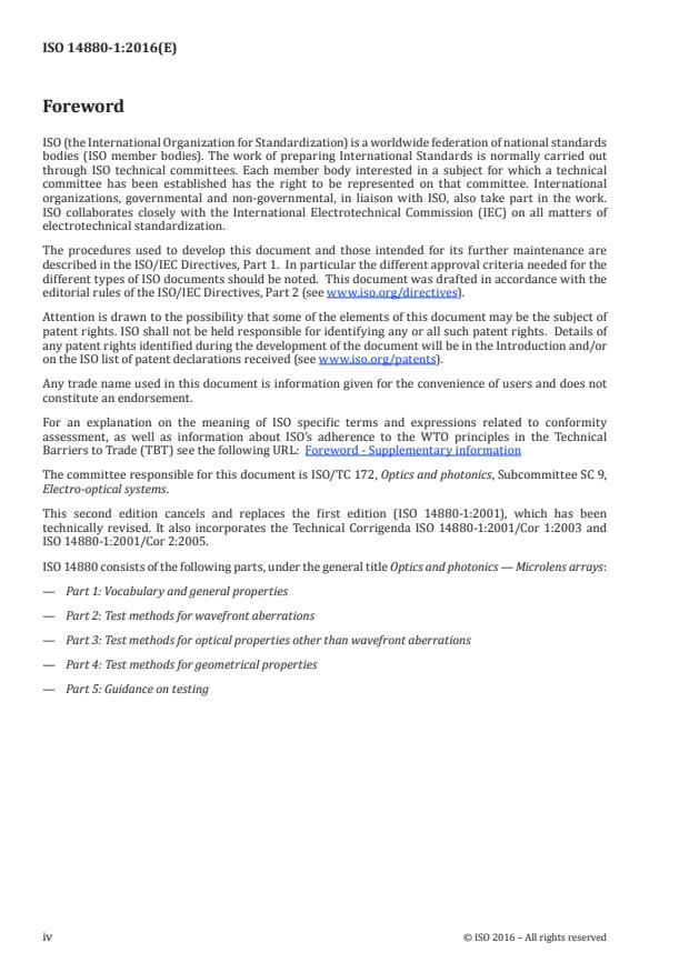 ISO 14880-1:2016 defines terms for microlens arrays. It applies to microlens arrays which consist of arrays of very small lenses formed inside or on one or more surfaces of a common substrate and systems. The aim of ISO 14880-1:2016 is to improve the compatibility and interchangeability of lens arrays from different suppliers and to enhance the development of technology using microlens arrays.