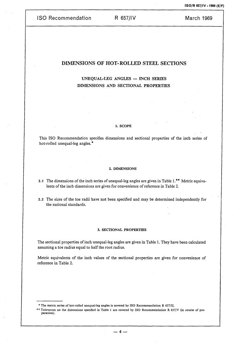 ISO/R 657-4:1969 is a standard published by the International Organization for Standardization (ISO). Its full title is "Dimensions of hot-rolled steel sections — Part 4: Unequal-leg angles — Inch series — Dimensions and sectional properties". This standard covers: Dimensions of hot-rolled steel sections — Part 4: Unequal-leg angles — Inch series — Dimensions and sectional properties