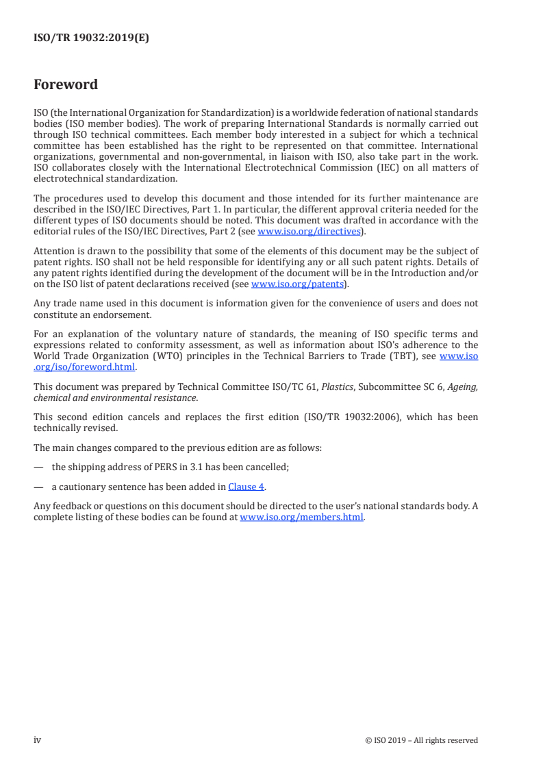 Keywords: ISO/TR 19032:2019, PERS, polyethylene reference specimens, carbonyl index, weathering tests, accelerated exposure, xenon‑arc, carbon‑arc, fluorescent lamp, outdoor exposure, plastics testing.