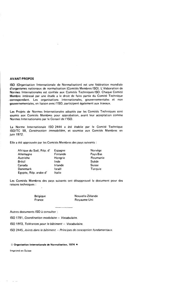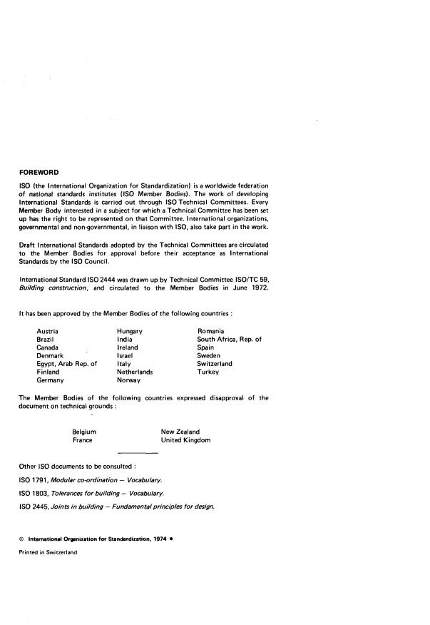 ISO 2444:1974 is a standard published by the International Organization for Standardization (ISO). Its full title is "Joints in building — Vocabulary". This standard covers: Joints in building — Vocabulary