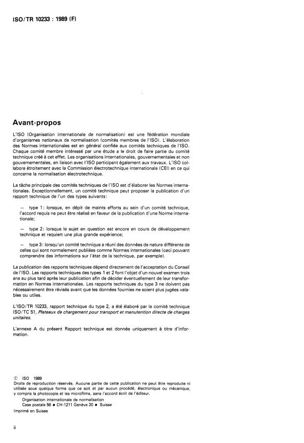 ISO/TR 10233:1989 - Palettes plates d'usage général pour le transport de marchandises -- Exigences de performances