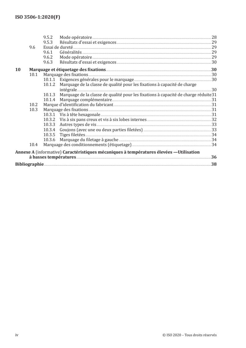 Le présent document spécifie les caractéristiques mécaniques et physiques des vis, goujons et tiges filetées, à filetage à pas gros et à filetage à pas fin, en aciers inoxydables résistant à la corrosion, lorsque soumis à essai dans la plage de température ambiante de 10 °C à 35 °C. Il spécifie les classes de qualité en fonction des grades d'aciers inoxydables austénitiques, martensitiques, ferritiques et duplex (austéno-ferritiques) pour les fixations. Le terme «fixation» est utilisé dans le présent document lorsque les vis, goujons et tiges filetées sont considérés dans leur ensemble. L'ISO 3506‑6 fournit des règles générales et des informations techniques supplémentaires sur les aciers inoxydables appropriés ainsi que leurs propriétés. Les fixations conformes aux exigences du présent document sont évaluées dans la plage de température ambiante spécifiée dans l'alinéa 1. Elles peuvent ne pas conserver les caractéristiques mécaniques et physiques spécifiées à des températures élevées et/ou basses. NOTE 1 Les fixations conformes aux exigences du présent document sont utilisées sans restriction pour des applications dans la plage de ? 20 °C à + 150 °C; cependant, les fixations conformes au présent document sont également utilisées pour des applications en dehors de cette plage, en températures négatives jusqu'à ? 196 °C et en températures élevées jusqu'à + 300 °C. Pour d'avantage d'explications, voir l'Annexe A et l'ISO 3506‑6. En dehors de la plage de température de ? 20 °C à + 150 °C , il est de la responsabilité de l'utilisateur de déterminer le choix approprié pour une application donnée en concertation avec un métallurgiste expérimenté en fixations et en prenant en considération plusieurs facteurs, par exemple la composition de l'acier inoxydable, la durée d'exposition à température élevée ou basse, l'effet de la température sur les caractéristiques mécaniques des fixations et des pièces assemblées, ainsi que l'environnement corrosif d'utilisation de l'assemblage vissé. NOTE 2 L'ISO 3506‑5 est développée afin d'aider à la sélection des grades d'aciers inoxydables et des classes de qualité appropriées destinés à être utilisés à des températures jusqu'à + 800 °C. Le présent document s'applique aux vis, goujons et tiges filetées: — à filetage métrique ISO conforme à l'ISO 68‑1; — de combinaisons diamètre/pas, conformes à l'ISO 261 et à l'ISO 262; — de filetage M1,6 à M39 pour les pas gros, et de filetage M8×1 à M39×3 pour les pas fins; — de tolérances de filetage conformes à l'ISO 965‑1 et à l'ISO 965‑2; — de classes de qualité spécifiées; et — de forme quelconque. Les grades d'aciers inoxydales et classes de qualité peuvent être utilisés pour des dimensions en dehors des limites de diamètres du présent document (c'est-à-dire pour d d > 39 mm), à condition que toutes les exigences chimiques, mécaniques et physiques applicables soient satisfaites. Certaines vis, goujons et tiges filetées peuvent ne pas satisfaire aux exigences de la résistance à la traction ou à la torsion du présent document en raison de la géométrie de leur tête ou de leur partie lisse (tige), ce qui a pour conséquence une capacité de charge réduite (par exemple lorsque la section cisaillée dans la tête est inférieure à la section résistante dans le filetage, voir 8.2.2). Le présent document ne s'applique pas aux vis sans tête et fixations filetées similaires non soumises à des contraintes de traction (voir l'ISO 3506‑3). Il ne spécifie pas d'exigence pour des caractéristiques fonctionnelles telles que: — les caractéristiques de couple/tension; — la résistance au cisaillement; — la résistance à la fatigue; ou — la soudabilité.