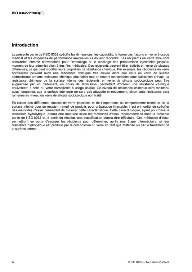 L'ISO 8362-1:2003 spécifie la forme, les dimensions et les capacités des flacons en verre pour préparation injectable. Elle spécifie également le matériau constitutif et les exigences auxquelles ces flacons doivent répondre.. L'ISO 8362-1:2003 est applicable aux flacons en verre blanc ou ambré, en verre borosilicaté ou en verre de silicate sodocalcique, obtenus à partir de verre étiré, avec une surface interne traitée ou non, conçus pour l'emballage, le stockage ou le transport des produits injectables.