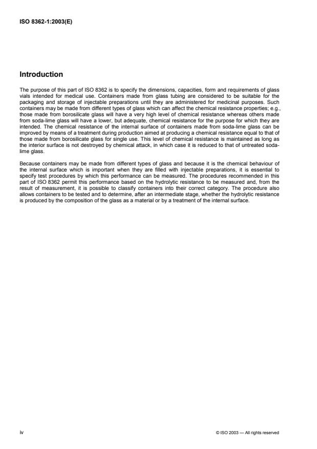 ISO 8362-1:2003 specifies the form, dimensions and capacities of glass vials for injectable preparations. It also specifies the material from which such containers shall be made and the performance requirements of those containers. ISO 8362-1:2003 applies to colourless or amber glass containers made from borosilicate or soda-lime glass, in the form of glass tubing, whether internally surface-treated or not, and intended for use in the packaging, storage or transportation of products intended for injection.