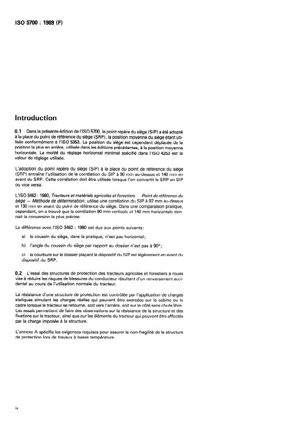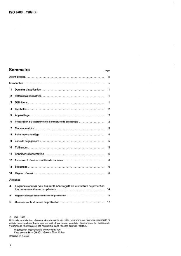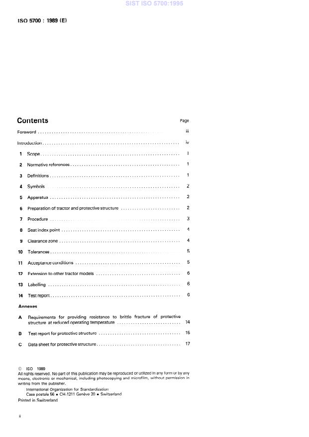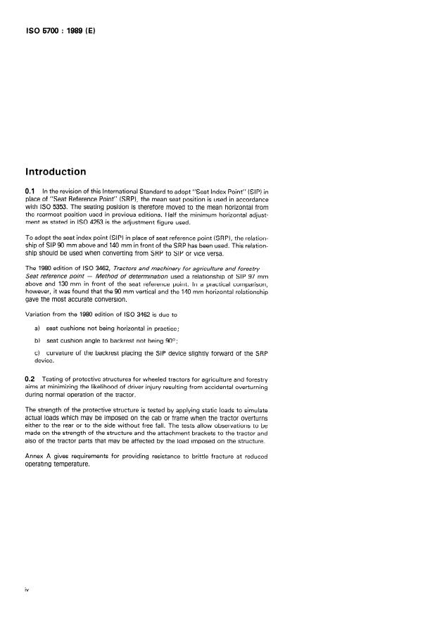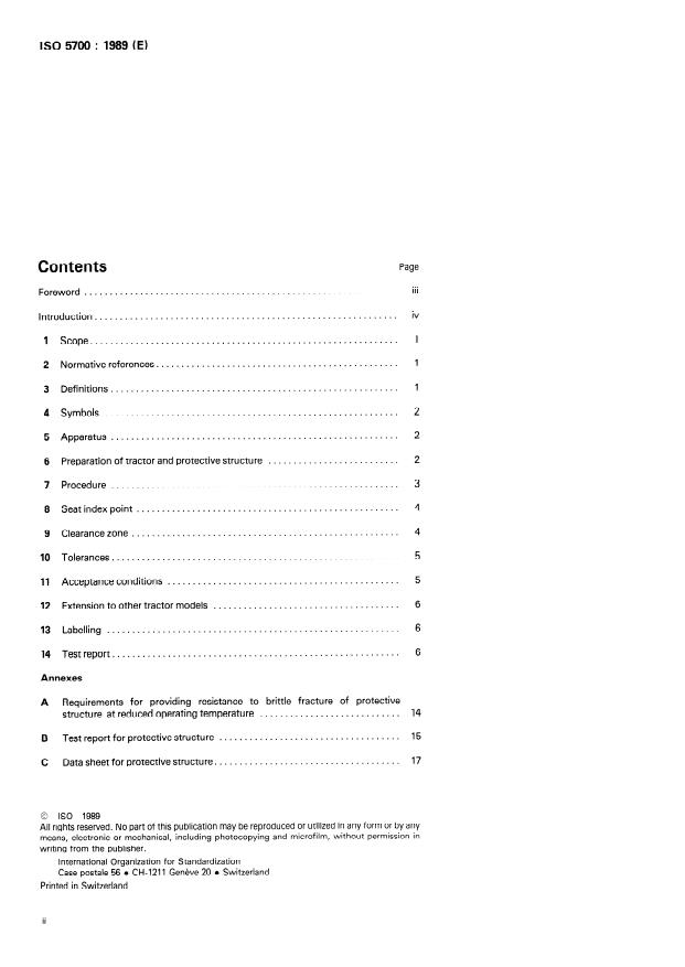 ISO 5700:1989 is a standard published by the International Organization for Standardization (ISO). Its full title is "Wheeled tractors for agriculture and forestry — Protective structures — Static test method and acceptance conditions". This standard covers: This third edition cancels and replaces the second edition (1984) . Specifies a static loading test method and applies to tractors having at least two axles for pneumatic-tyred wheels, with or without track attachments, and with a tractor mass not less than 800 kg and not more than 15 000 kg. Annex A contains requirements for providing resistance to brittle fracture of protective structure at reduced operating temperature; annex B includes the test report and annex C the data sheet for protective structure.