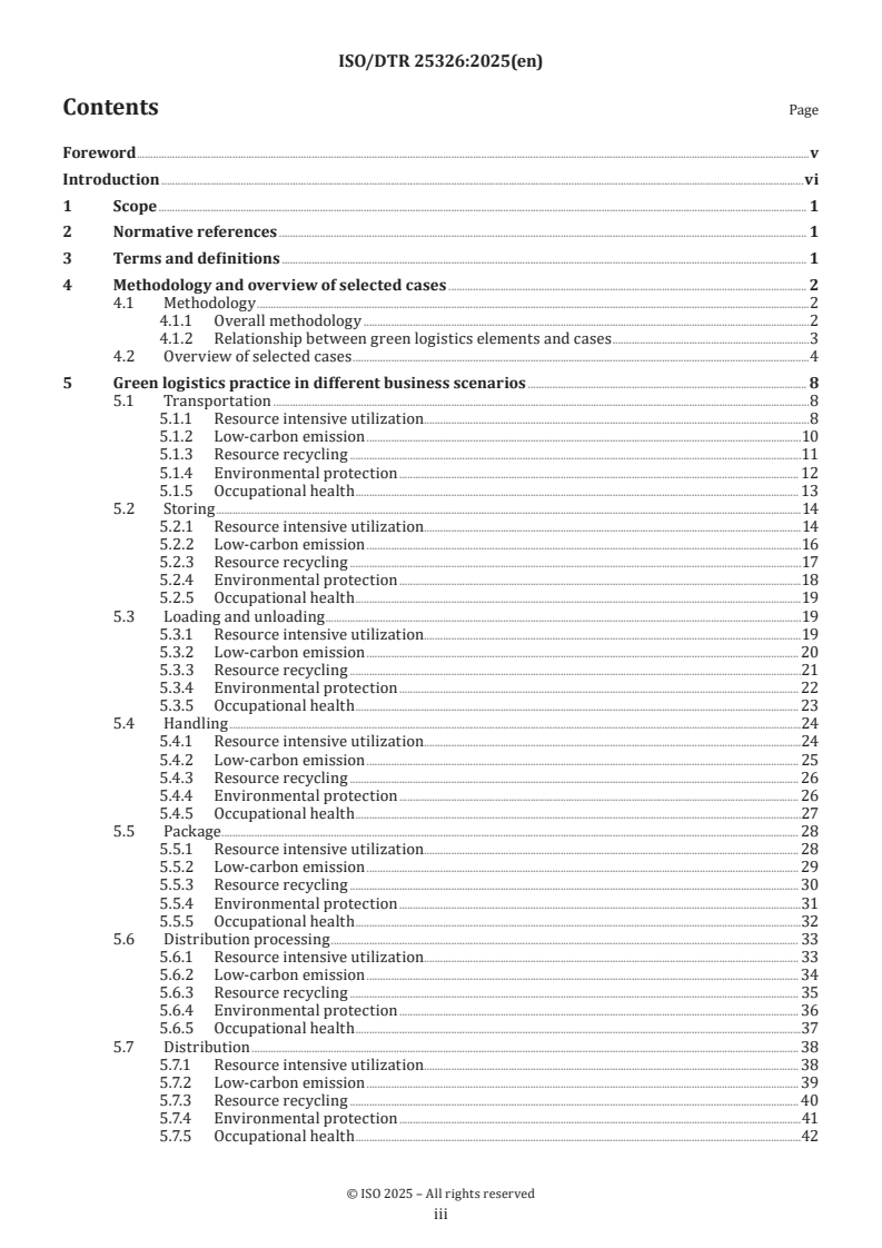 Keywords: ISO TR 25326, green logistics, sustainable logistics, low‑carbon logistics, logistics use cases, green supply chain, transport, warehousing, packaging, distribution processing, information processing.