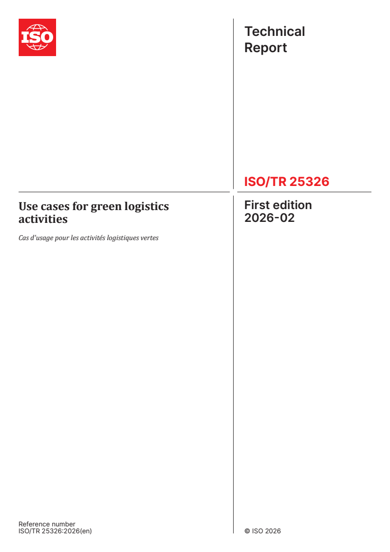ISO/TR 25326:2026 is a technical report published by the International Organization for Standardization (ISO). Its full title is "Use cases for green logistics activities". This standard covers: This document presents case studies and insights into the practical application of green logistics. The cases are delineated across various operational scenarios, including transport, storing, loading and unloading, handling, package, distribution processing, distribution and information processing. The objective of this document is to facilitate organizations in comprehending green logistics activities.