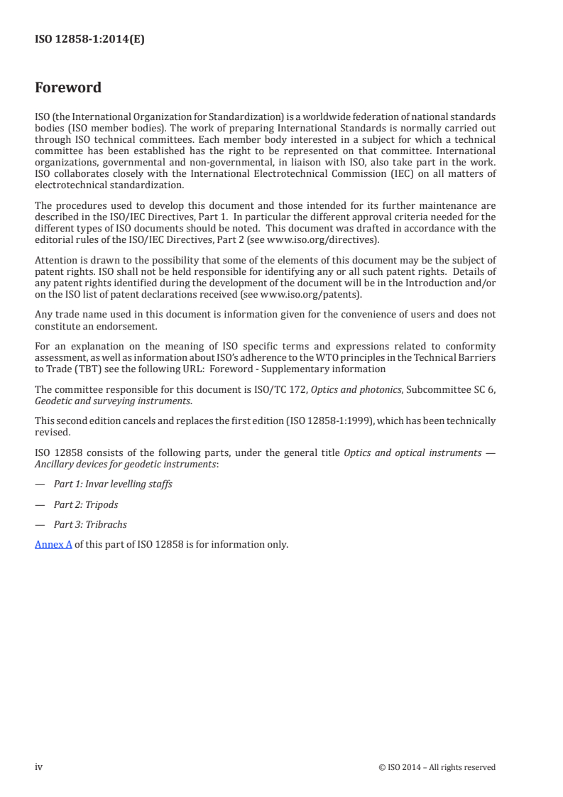 ISO 12858-1:2014 is a standard published by the International Organization for Standardization (ISO). Its full title is "Optics and optical instruments - Ancillary devices for geodetic instruments - Part 1: Invar levelling staffs". This standard covers: ISO 12858-1:2014 specifies the most important requirements of Invar levelling staffs used in geodesy and industry for precise measurement of heights in combination with either an optical-mechanical level equipped with a parallel plate micrometre, or a digital level of comparable precision. It is applicable to classical staffs with graduation lines and numbering and staffs used in digital levelling with code patterns. ISO 12858-1:2014 is not applicable to the detailed design and construction of Invar levelling staffs (e.g. materials, handles, fixing points for the struts, fixing of the Invar strip and of the circular level), which may be selected by the manufacturer as appropriate.