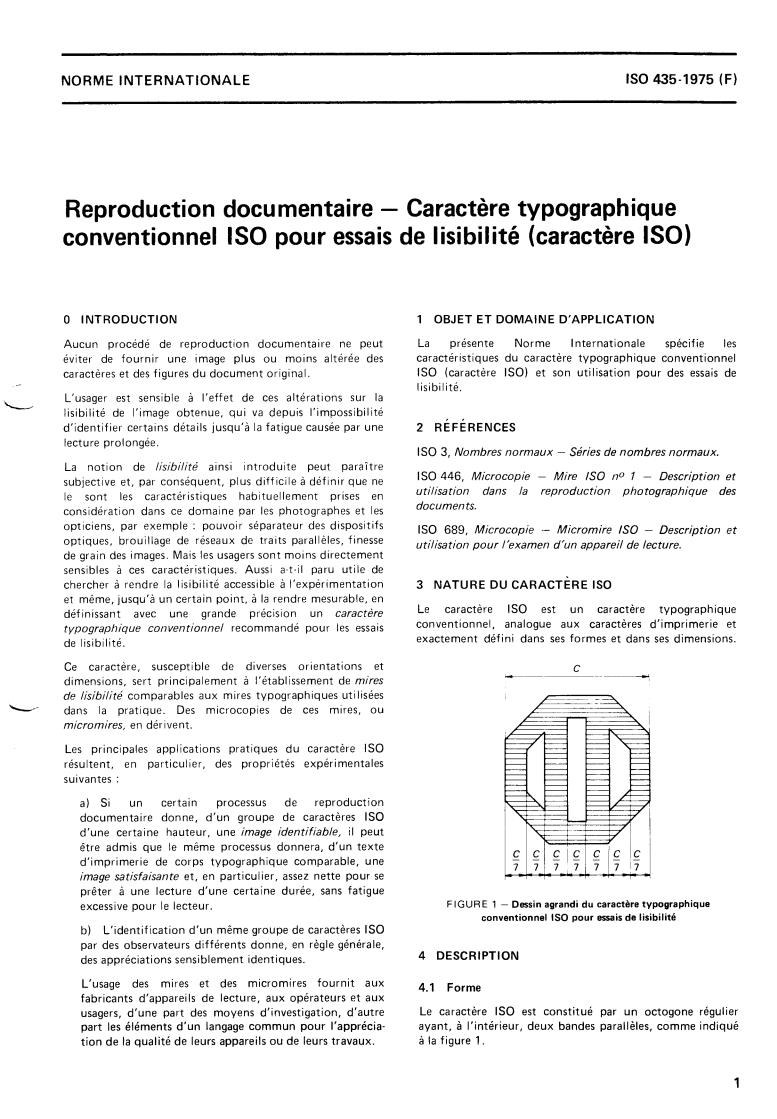 ISO 435:1975 is a standard published by the International Organization for Standardization (ISO). Its full title is "Documentary reproduction — ISO conventional typographical character for legibility tests (ISO character)". This standard covers: Documentary reproduction — ISO conventional typographical character for legibility tests (ISO character)