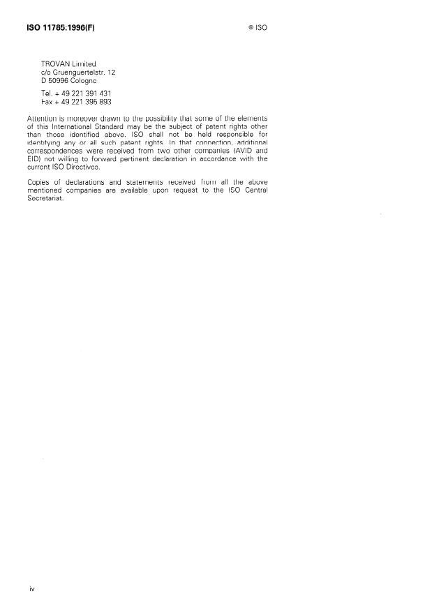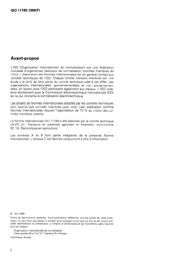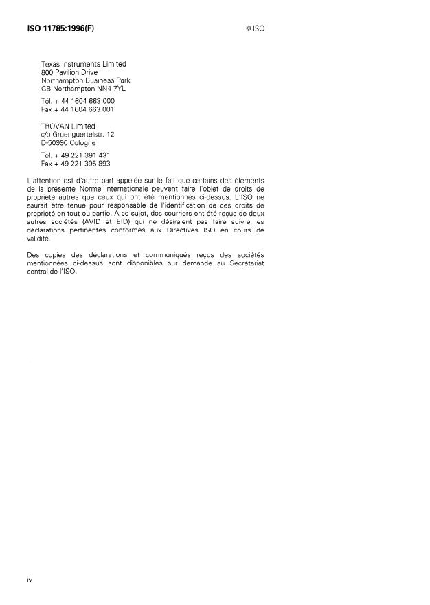 ISO 11785:1996 is a standard published by the International Organization for Standardization (ISO). Its full title is "Radio frequency identification of animals - Technical concept". This standard covers: La présente Norme internationale prescrit le mode d'activation d'un transpondeur et le mode de transfert des informations qui y sont enregistrées vers un émetteur-récepteur.