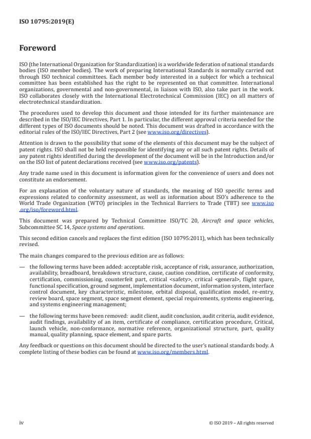 ISO 10795:2019 is a standard published by the International Organization for Standardization (ISO). Its full title is "Space systems — Programme management and quality — Vocabulary". This standard covers: This document provides definitions of all common terms used in the area of space systems and operations for programme management and quality. It does not contain terms specific to an individual International Standard in the area of space systems and operations, which are defined in that particular International Standard.