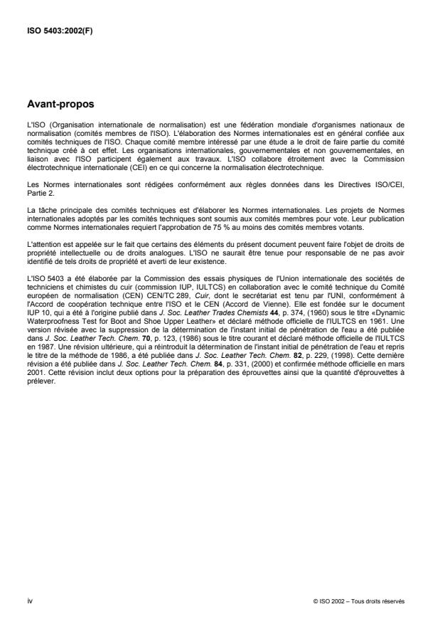 L'ISO 5403:2002 spécifie une méthode pour déterminer l'imperméabilité dynamique du cuir à l'eau. Elle s'applique à tous les cuirs souples mais elle convient particulièrement aux cuirs pour dessus de chaussure.