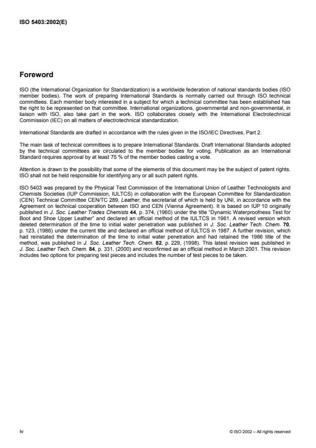 ISO 5403:2002 is a standard published by the International Organization for Standardization (ISO). Its full title is "Leather — Physical and mechanical tests — Determination of water resistance of flexible leather". This standard covers: ISO 5403:2002 specifies a method for determining the dynamic water resistance of leather. It is applicable to all flexible leathers but is particularly suitable for leathers intended for footwear uppers.