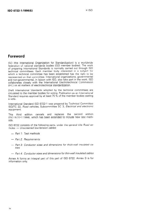 ISO 6722-1:1996 is a standard published by the International Organization for Standardization (ISO). Its full title is "Road vehicles — Unscreened low-tension cables — Part 1: Test methods". This standard covers: Gives the test methods for unscreened single-core low-tension cables (nominal voltage of 50 V) used in road vehicle applications. It also applies to the individual cores in multi-core cables. Replaces the second edition.