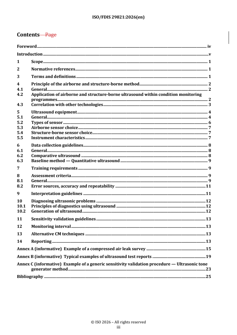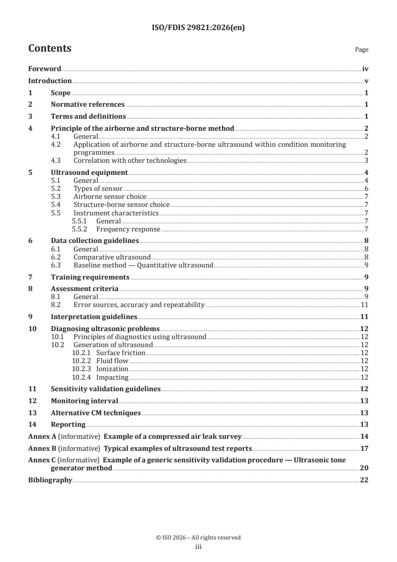 ISO/FDIS 29821 is a draft published by the International Organization for Standardization (ISO). Its full title is "Condition monitoring and diagnostics of machine systems — Ultrasound — General requirements, guidelines, procedures and validation". This standard covers: ISO 29821:2018 - gives guidelines for establishing severity assessment criteria for anomalies identified by airborne (AB) and structure-borne (SB) ultrasound, - specifies methods and requirements for carrying out ultrasonic examination of machines, including safety recommendations and sources of error, and - provides information relative to data interpretation, assessment criteria and reporting.