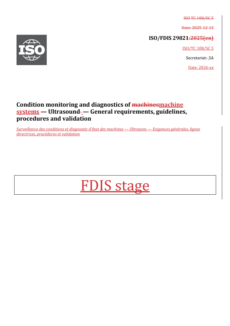REDLINE ISO/FDIS 29821 - Condition monitoring and diagnostics of machine systems — Ultrasound — General requirements, guidelines, procedures and validation Released:15. 01. 2026