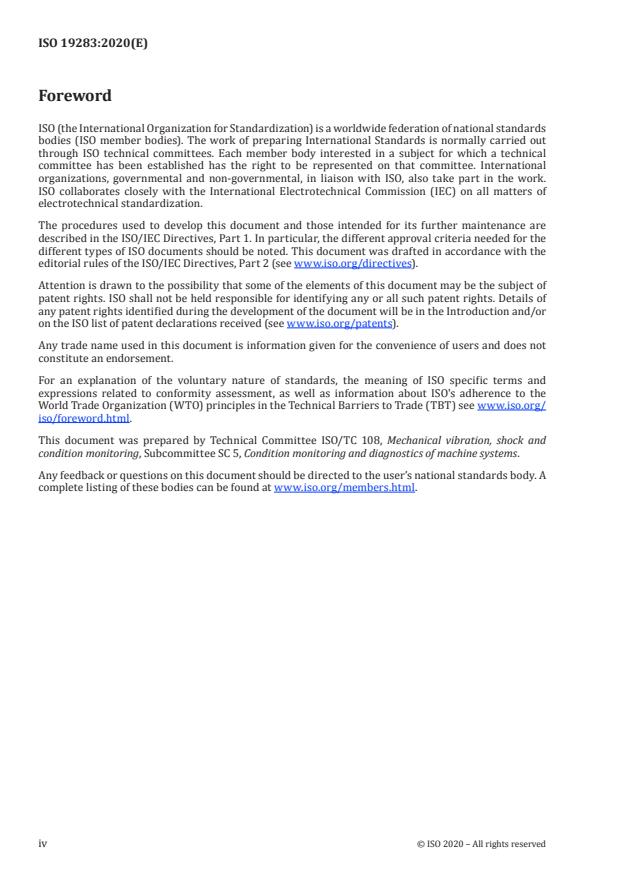 ISO 19283 references and aligns with industry guidance such as ISO 17359 (CBM strategy), ISO 13374 series (data processing and information exchange), and other standards cited for implementation and evaluation (e.g., ISO 13379, ISO 20816 series, IEC documents). These help integrate ISO 19283 into a broader condition monitoring and reliability framework.