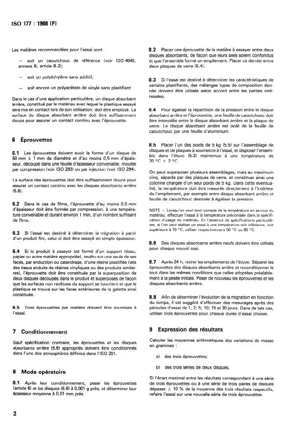 ISO 177:1988 - Plastiques -- Détermination de la migration des plastifiants