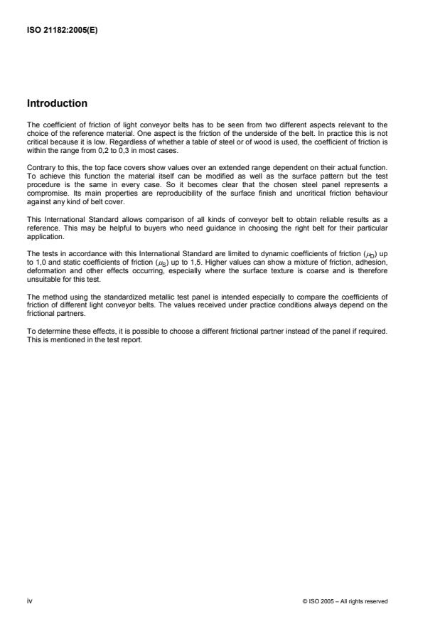 ISO 21182:2005 is a standard published by the International Organization for Standardization (ISO). Its full title is "Light conveyor belts — Determination of the coefficient of friction". This standard covers: ISO 21182:2005 specifies test methods for determining the dynamic and static coefficients of friction for light conveyor belts according to ISO 21183-1.