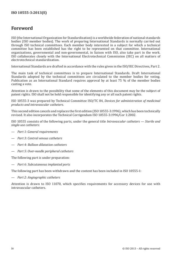 ISO 10555-3:2013 is a standard published by the International Organization for Standardization (ISO). Its full title is "Intravascular catheters — Sterile and single-use catheters — Part 3: Central venous catheters". This standard covers: ISO 10555-3:2013 specifies requirements for central venous catheters supplied in the sterile condition, and intended for single use.