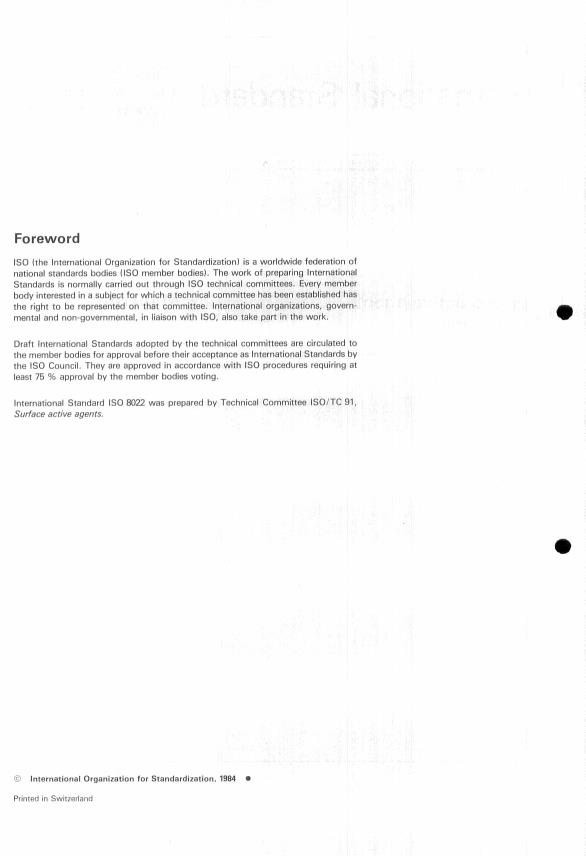 ISO 8022:1984 is a standard published by the International Organization for Standardization (ISO). Its full title is "Surface active agents — Determination of wetting power by immersion". This standard covers: Surface active agents — Determination of wetting power by immersion