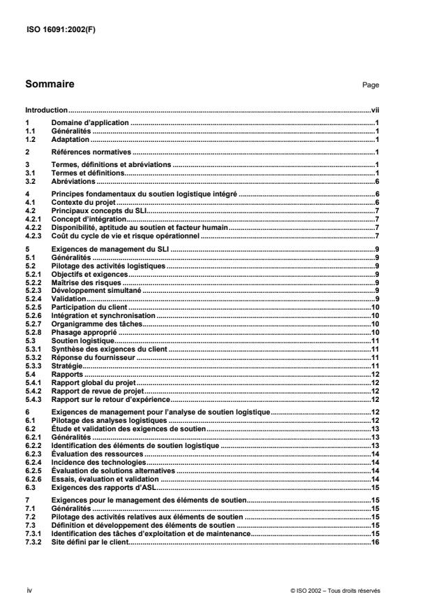 L'ISO 16091:2002 décrit l'ensemble des exigences de management nécessaires à l'identification et à la fourniture d'un soutien logistique permettant au client d'exploiter et d'assurer la maintenance d'un produit dans son environnement opérationnel pendant la durée de vie prévue. Ces exigences visent également, pendant le cycle de vie du produit, à la mise en oeuvre de tout ce qui est nécessaire à la maîtrise des risques considérés comme critiques au vu des objectifs opérationnels. Ces exigences de management sont applicables aux activités nécessaires à la conception, au développement, à la livraison, au déploiement et à la gestion d'un ensemble organisé et structuré de matériels et logiciels, de services, de processus et d'informations dédié au soutien du système pendant tout son cycle de vie. L'ISO 16091:2002 spécifie les activités de management, d'études et de production, les processus et les tâches de gestion des informations destinés à satisfaire les besoins du client en matière de soutien logistique.
