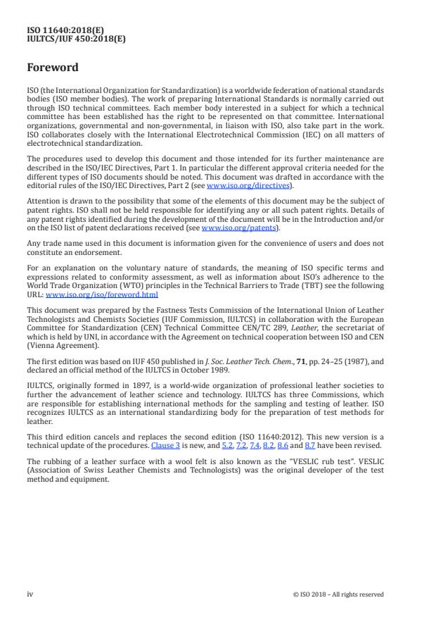 ISO 11640:2018 is a standard published by the International Organization for Standardization (ISO). Its full title is "Leather — Tests for colour fastness — Colour fastness to cycles of to-and-fro rubbing". This standard covers: This document specifies a method for determining the behaviour of the surface of a leather on rubbing with a wool felt. It is applicable to leathers of all kinds.