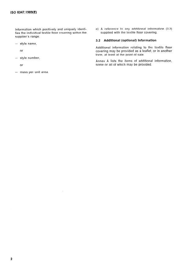 ISO 6347:1989 is a standard published by the International Organization for Standardization (ISO). Its full title is "Textile floor coverings — Consumer information". This standard covers: Applicable to textile floor coverings of all types. Specifies the technical matters forming the basis for the provision of information, at the point of sale, for the guidance of the consumer prior to and after the purchase of a textile floor covering. This information shall be provided with the textile floor coverings at all stages from manufacturer to consumer.