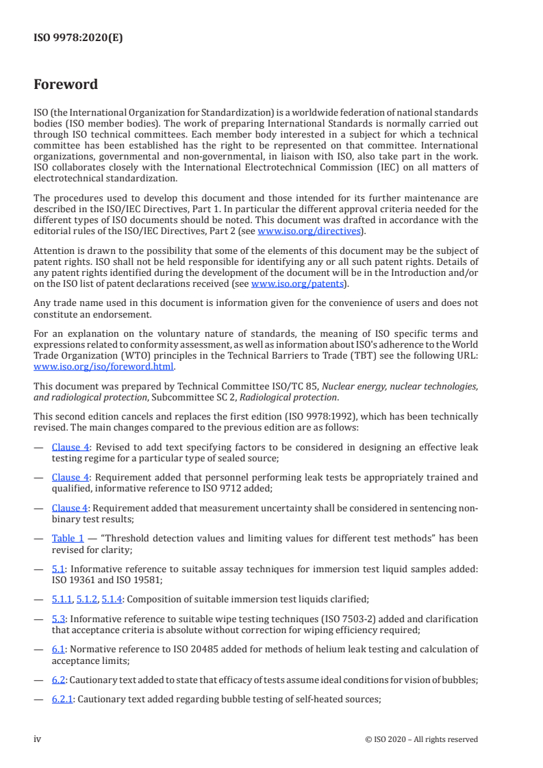 ISO 9978:2020 is a standard published by the International Organization for Standardization (ISO). Its full title is "Radiation protection - Sealed sources - Leakage test methods". This standard covers: This document specifies the different leakage test methods for sealed sources. It gives a comprehensive set of procedures using radioactive and non-radioactive means. This document applies to the following situations: - leakage testing of test sources following design classification testing in accordance with ISO 2919[1]; - production quality control testing of sealed sources; - periodic inspections of the sealed sources performed at regular intervals, during the working life. Annex A of this document gives guidance to the user in the choice of the most suitable method(s) according to situation and source type. It is recognized that there can be circumstances where special tests, not described in this document, are required. It is emphasized, however, that insofar as production, use, storage and transport of sealed radioactive sources are concerned, compliance with this document is no substitute for complying with the requirements of the relevant IAEA regulations[17] and other relevant national regulations. It is also recognized that countries can enact statutory regulations which specify exemptions for tests, according to sealed source type, design, working environment, and activity (e.g., for very low activity reference sources where the total activity is less than the leakage test limit).
