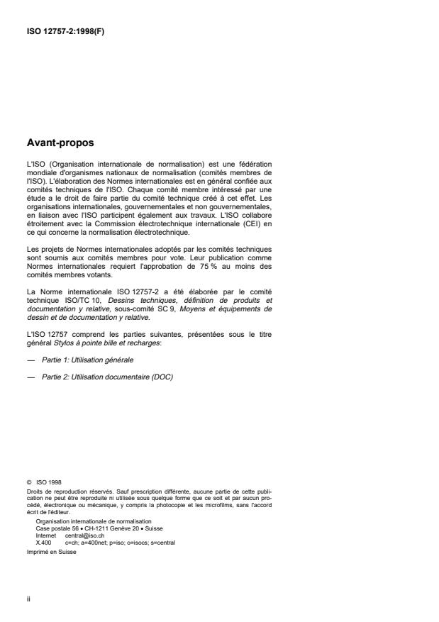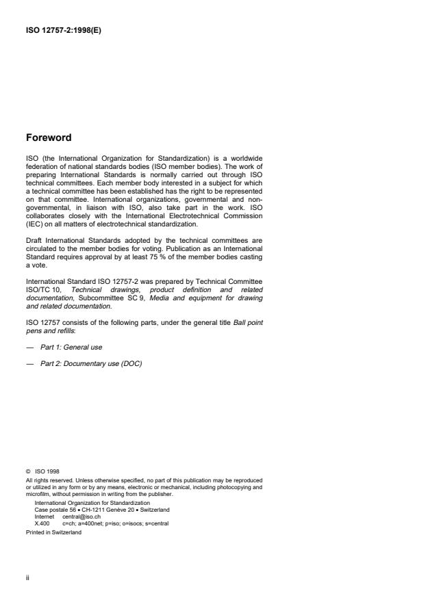 ISO 12757-2:1998 is a standard published by the International Organization for Standardization (ISO). Its full title is "Ball point pens and refills - Part 2: Documentary use (DOC)". This standard covers: La présente partie de l'ISO 12757 fixe les prescriptions minimales de qualité des stylos à pointe bille (rechargeables ou non) et de leurs recharges en utilisation documentaire. Les prescriptions de base des stylos à pointe bille pour une utilisation générale sont données dans l'ISO 12757-1.