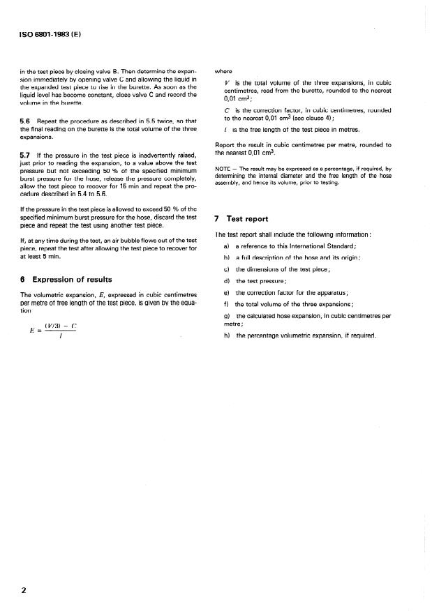 ISO 6801:1983 is a standard published by the International Organization for Standardization (ISO). Its full title is "Rubber or plastics hoses — Determination of volumetric expansion". This standard covers: Specifies a test method for hoses under hydrostatic pressure. When used for dispensing specific volumes of fluids, the volumetric capacity of a hose is often required to vary by only small amounts at the dispensing pressure. The standard describes a method of checking that such requirements can be met. A figure shows the arrangement of the apparatus.