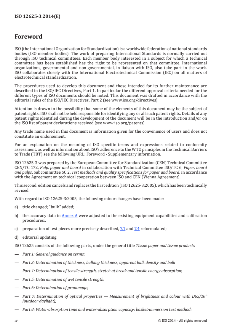 ISO 12625-3:2014 specifies a test method for the determination of thickness and bulking thickness and the calculation of apparent bulk density and bulk of tissue papers and tissue products under a pressure of 2,0 kPa.