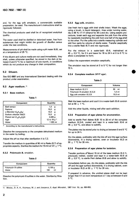 ISO 7932:1987 is a standard published by the International Organization for Standardization (ISO). Its full title is "Microbiology — General guidance for enumeration of Bacillus cereus — Colony count technique at 30 degrees C". This standard covers: Microbiology — General guidance for enumeration of Bacillus cereus — Colony count technique at 30 degrees C