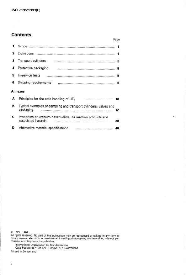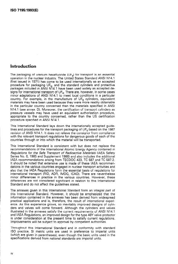 Specifies requirements concerning the design, manufacture and testing of transport cylinders and packaging, the in-service testing and shipping requirements. Annex A includes principles for the safe handling of UF6, annex B gives typical examples of sampling and transport cylinders, valves and packaging, annex C describes properties of UF6, its reaction products and associated hazards.