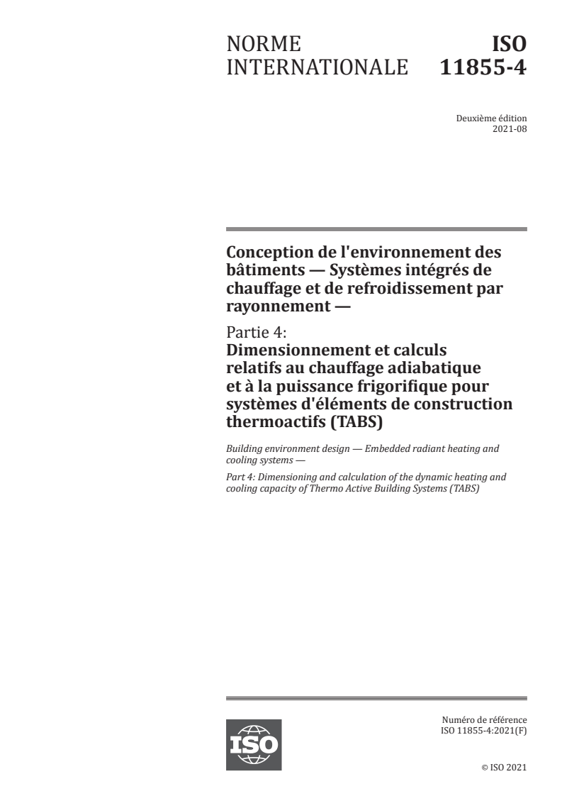 ISO 11855-4:2021 - Conception de l'environnement des bâtiments — Systèmes intégrés de chauffage et de refroidissement par rayonnement — Partie 4: Dimensionnement et calculs relatifs au chauffage adiabatique et à la puissance frigorifique pour systèmes d'éléments de construction thermoactifs (TABS) Released:8/5/2021